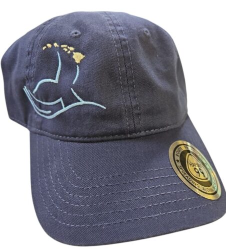 Ever popular baseball dad caps with embroidered Whale with Hawaiian islands.